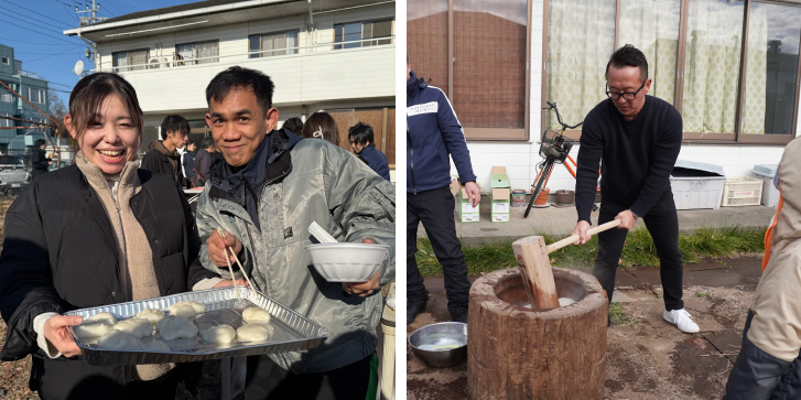 2025年12月27日、社員寮にて毎年恒例となっている餅つき大会を開催し、本年の仕事納めを迎えました。