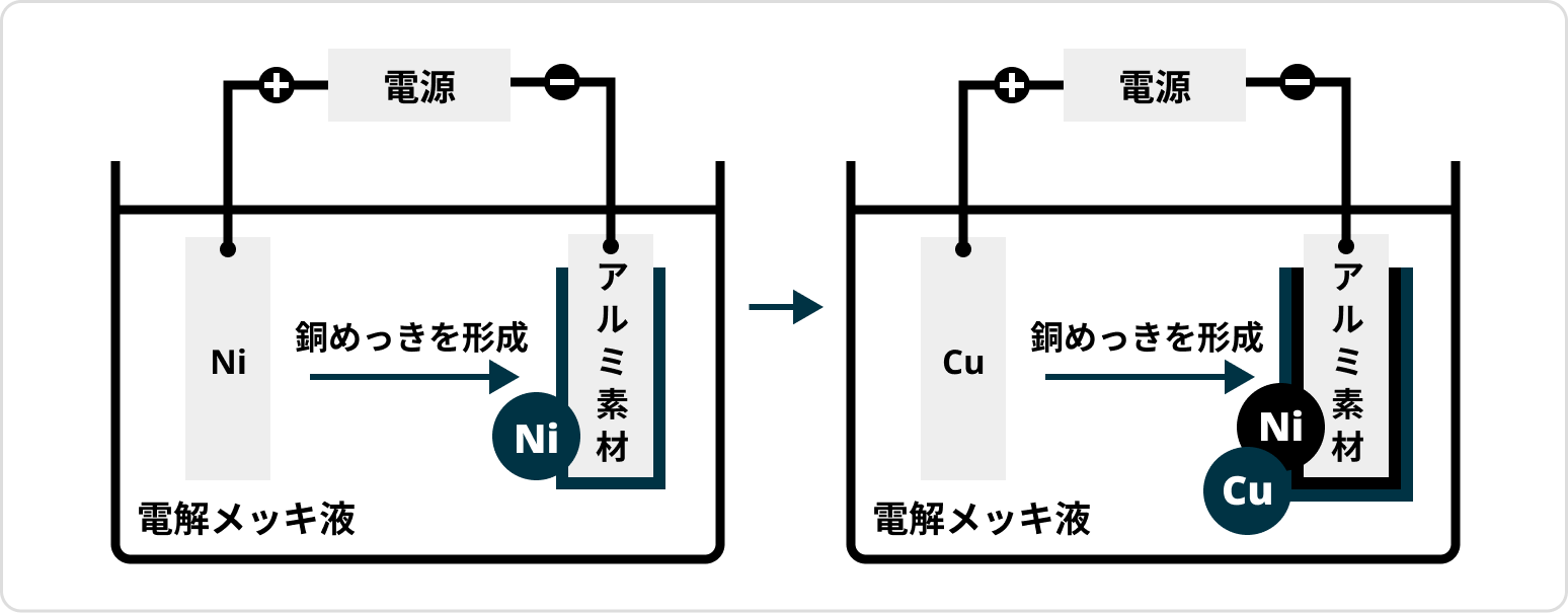 アルミニウムは酸化被膜を形成しやすく、そのままではめっきの密着性が低いため密着性確保のための前処理が不可欠です。ニッケルは耐食性・密着性を向上させる下地として機能し、銅は高導電性を付与します。多層化によって特性を組み合わせることが可能です。